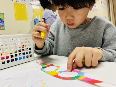 今日のArtはカラフルなパーティメガネ作りに挑戦。色々な材料を使ってデコレーションしたり凝った色で自分を表現、それぞれの個性を活かしながら楽しみました。