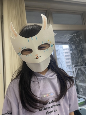 色々なアイデアを出し、世界でたった一つの可愛いマスクが出来ました。出来上がったマスクを付けたら、ハロウィンみたいで楽しかったね。