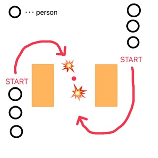 2チームに分かれ、違う場所から両チーム同時にスタートしてケンケンします。