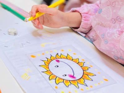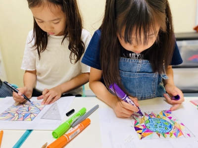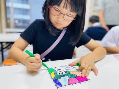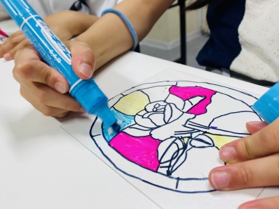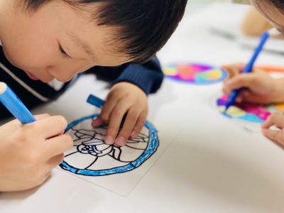 本日はステンドグラス作りを体験、透明な素材にみんな自分が好きな色やデザインで描き、感性溢れる作品に。窓に飾ると太陽を浴びて素敵な雰囲気が楽しめます。