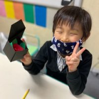 本日は折り紙の様ですね。 何ができあがるのでしょうか。 結構折り方が難しいところもあり、画用紙でやったので堅くて少し苦戦したところもありました。 そんな時は”Help me please.”の声が …