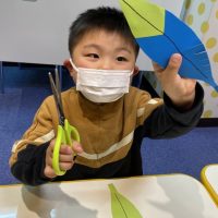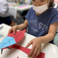 皆一生懸命色画用紙を切っていますが、何を作っているのでしょう? 何か分かりますか? 正解はfeathers(羽)です! 今回のアートは羽根をたくさん作りました。 “Which color do you wan …