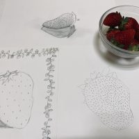 本日のArtは”Sketch of Spring” 春の果物、イチゴをスケッチしました! スケッチをする前にしっかりと観察をします。 イチゴの色、種、ヘタの様子をよく観察します。 薄らと見える種の色も細かく描いたり、 イ …