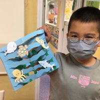 深い深い海の中。区分された3つの層にはそれぞれ異なる生き物が住んでいます。 今月のテーマ「Ocean Life」で学習してきたことを踏まえて、アートでは立体的な海の世界を作りました。 海の生き物に色を塗り… 海藻の形に切 …