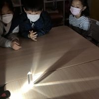 November Week 3の「Light」 今日は光のプリズムからRainbowができる 仕組みを学びました! ガラスでできたPrism。 「Wow,, it’s so beautiful 💖」 三角柱の不思議なガラ …