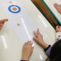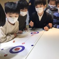 12月のバースデーパーティーのテーマはカーリングです。 早速、2組に分かれてゲーム開始! コインを赤の的のところに止めるとポイントがつきます。 お見事! 高さや向きを変えたり、台に石鹸をつけたりして ゲーム …