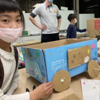 タイヤのホイルかな?? 良くみていますね、「I like cars!」 Science-Wheelsでは 先週に続きオリジナルWagon作成。 さらにデザインを加える子ども達や デコレーションする子ども達で、 役割分担。 …