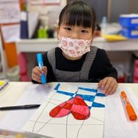 来週はValentine’s Day✨ ハートをモチーフにしたArtに挑戦しました❤️ 全部で4色をデザインの様に重ならないよう塗っていきます🧡💛 みんなとってもcolorfulにできました❣️ Great …