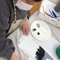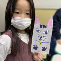 “If I were a cat…” もしも自分が猫だったらどんな色でどんな模様の猫でしょうか?自分が猫になった姿を想像して、猫型の紙に絵具で色を塗りました。 猫の目の色、形はどうでし …