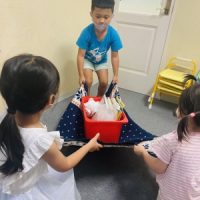 今月のテーマWeightで重さ比べを学習している子ども達は、今日は重さのある物資を 動かす事に目を向けてみました。 まずはそれぞれの重さを確認。 It’s heavy,, how can we lift this up? …