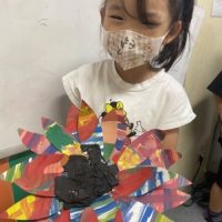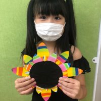2週間にわたるArt Projectが完成しました!先週絵の具で画用紙に多くの色を塗り、 今週は花びらの形に切って、ひまわりの中央に放射線状に貼っていきました。 完成です!均等に貼れて大満足! I’m almost fi …