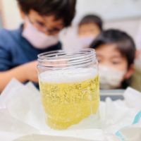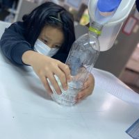 冬にちなんでペットボトルの中に吹雪を再現してみましょう。吹雪?どんな事をする実験なんだろう。子ども達も想像がつかない様子。 まずはペットボトルにお水を入れて。。。 次に白い絵の具をスポーン2杯ぐらい入れます …