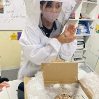 ACCESSのお部屋を覗くと先生達がProtecterを着て、なんだか重装備。なにがはじまるのでしょうか? 今日はBee hive observationを行います! Is there any bee?🐝 とおそるおそる …