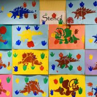 本日のアートは、ステンシル技法を使って作品を作りました。 ステンシルシートを紙の上に置いて、スポンジや筆で絵具をポンポンとのせていきました。何の形になるかな? 恐竜の足跡です。 今月のサイエンスでは、恐竜について学習して …