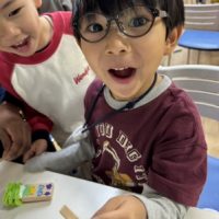 本日は初めに物と物をくっつける道具について学びます。 木と木をくっつけるには何が使えるかな? glue,nails,screws など色々な方法がありますね。どれを使えばより強力に着けられるのかクイズをしながら学びました …