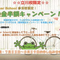 立川校限定! ACCESS/PreACCESSの 入会金半額キャンペーンを行います! 7/22から始まるSummer Schoolにご参加くださった方限定で8月中に入会の手続きをしてくださった場合、入会金¥55000が半 …