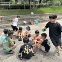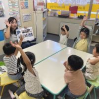 本日は、水遊び第2弾として「Duck Duck Splash(ダック・ダック・スプラッシュ)」というゲームを行いました。 このゲームは、円になって座り、鬼役の子が「Splash… Splash… …