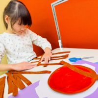 今日のアートは 先週と続きを行います! 先週たくさんペイントをした 画用紙たちは何になるでしょうか? 茶色くペイントした画用紙を 細長く切って… 織物のように縦の画用紙と横の画用紙で 編んでいきます😊 少しコツが必要でし …
