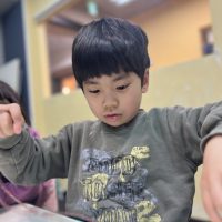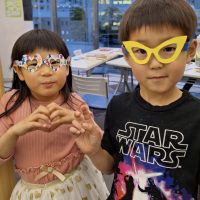 今日のアートは、パーティーメガネを作りましょう! 丸やハートのフレームの中から好きな形のメガネを選び、色を塗りました。 高学年のクラスでは、メガネの形から自分でデザインを考えました。 色を塗ったらハサミで切りました。細か …