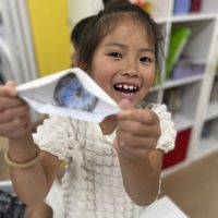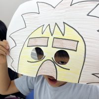 本日のArtのレッスンは 1枚の紙をつかって変身します😊 まずは先生が作ったお手本に 顔をはめてみます。。 一体だれだろう?! 隣に座ってたお友達が急に違う人みたい! 顔の上の部分が隠れると 誰だかわからな …