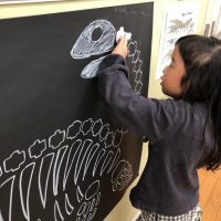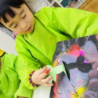 今日のアートはステンシルを使った綺麗なアートです。今月は恐竜の歴史について学んでいますね。恐竜を描いてみましょう! まずは土台になる紙を選び、好きな色を選びます。絵の具にスポンジを叩き込み、薄く細やかに紙にポンポンします …