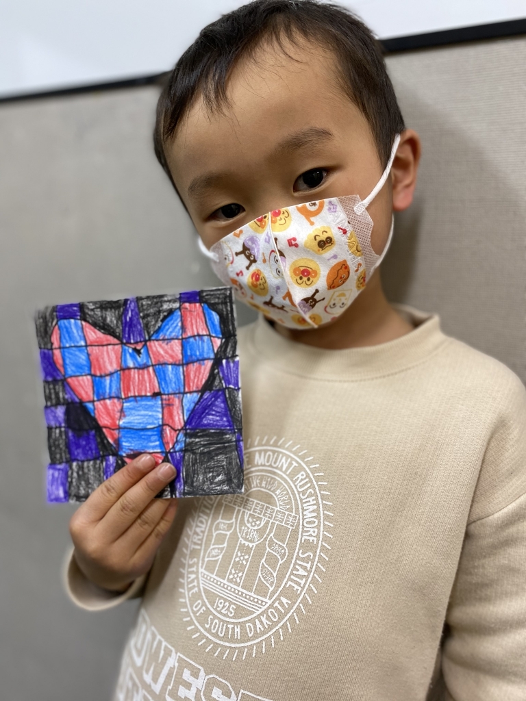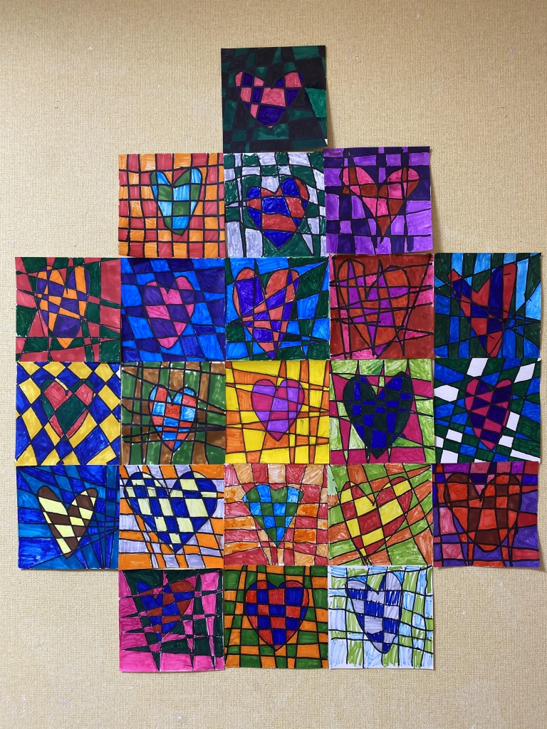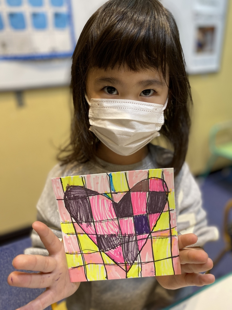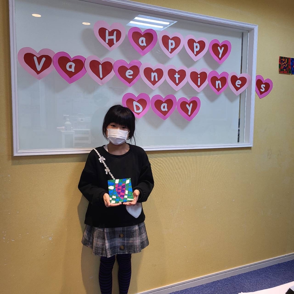 本日のアートは、「Full of Hearts」- 2月14日のバレンタインデーに向けて、五反田校ではたくさんのハートで溢れています。