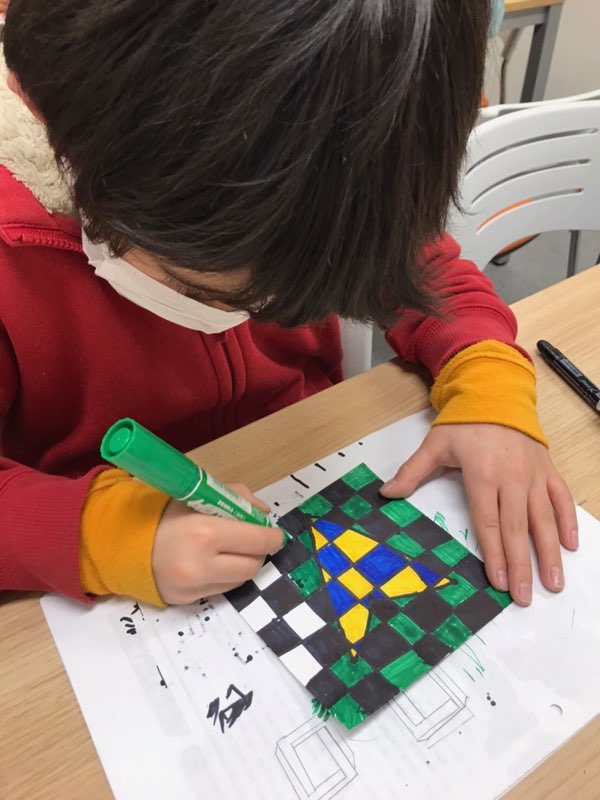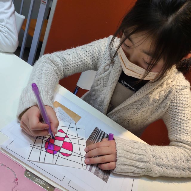 紙に描いたハートの上から縦と横にそれぞれ6-7本の線を引きました。そして、ハートの内側を2色のペンを使って交互に色を塗っていきました。