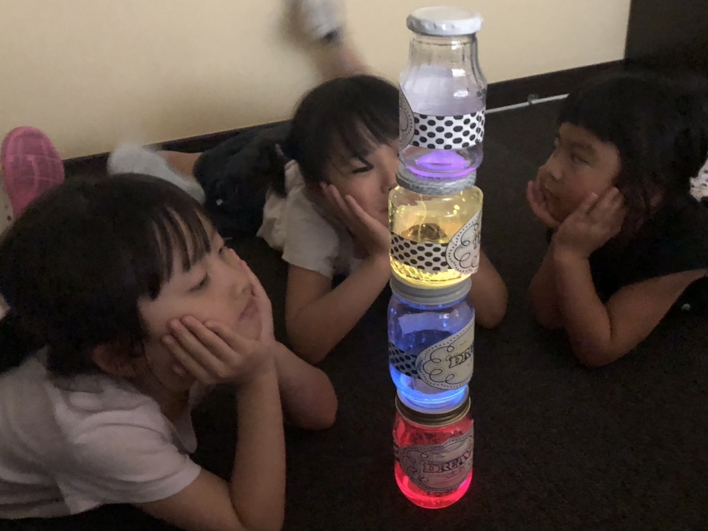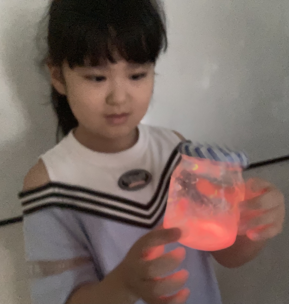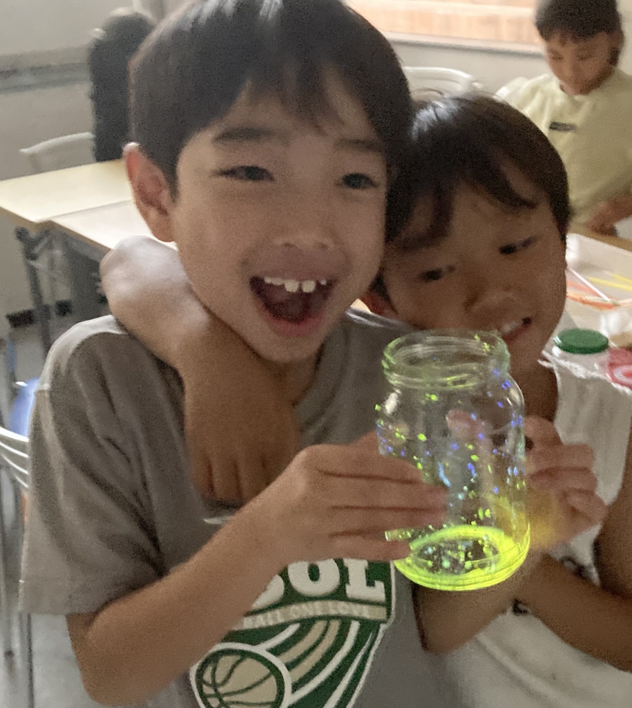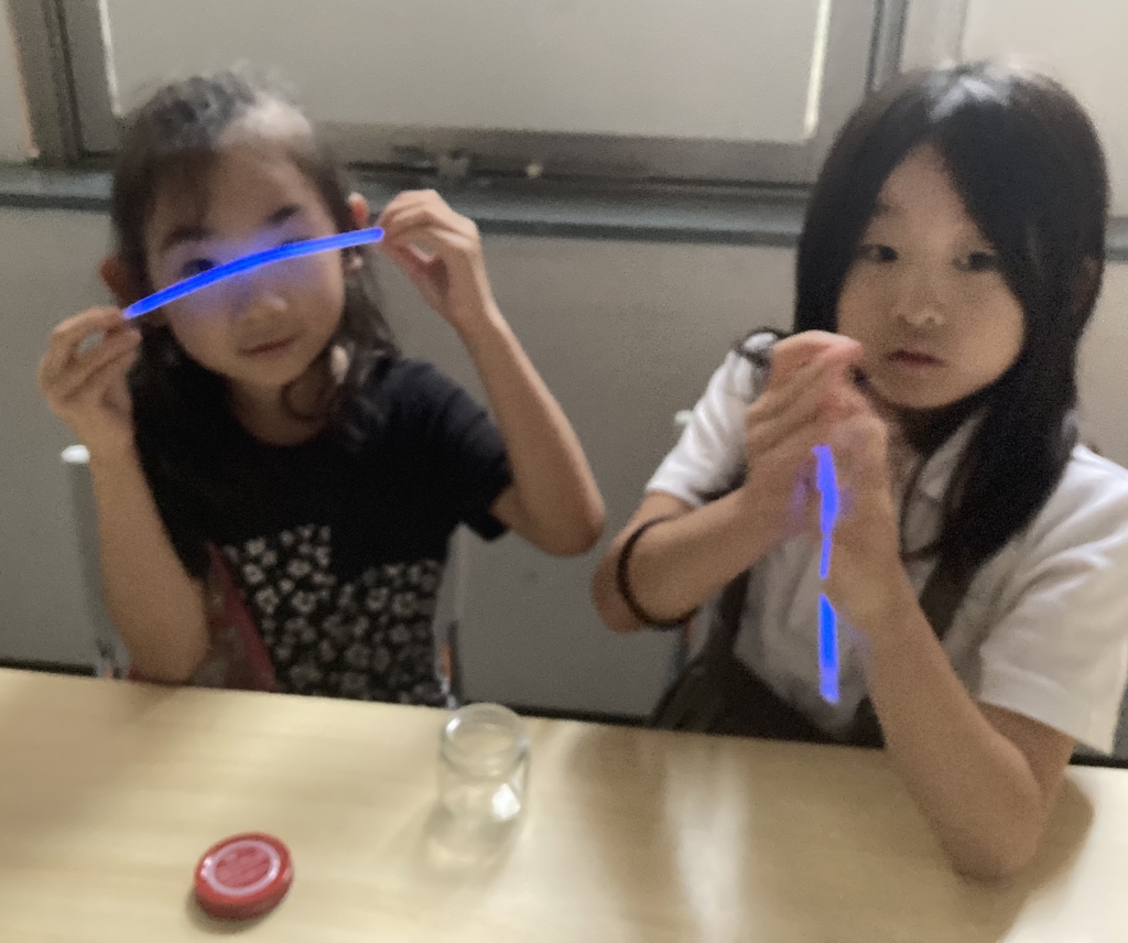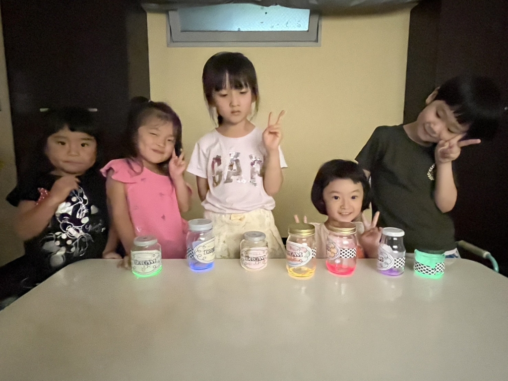 また今日の実験ではglow stickを使い、不思議な光るドリームジャーを作りました。