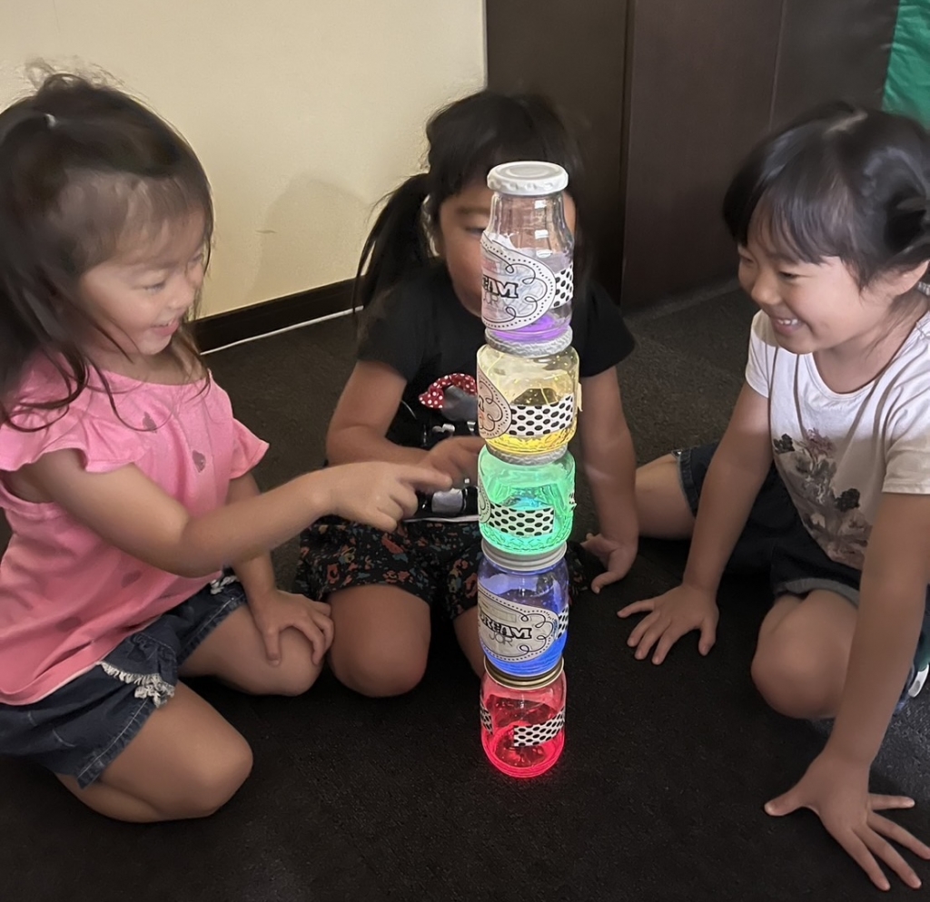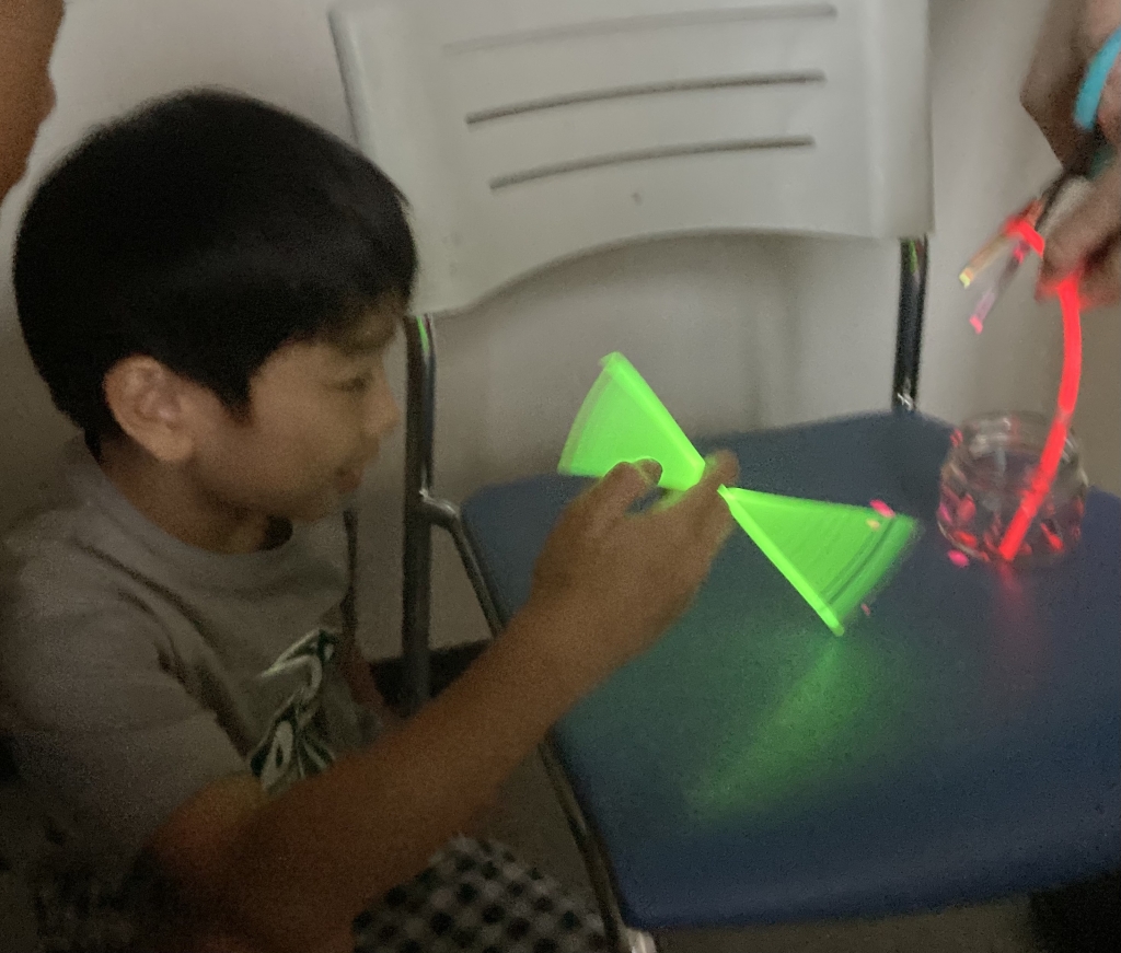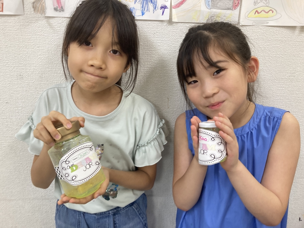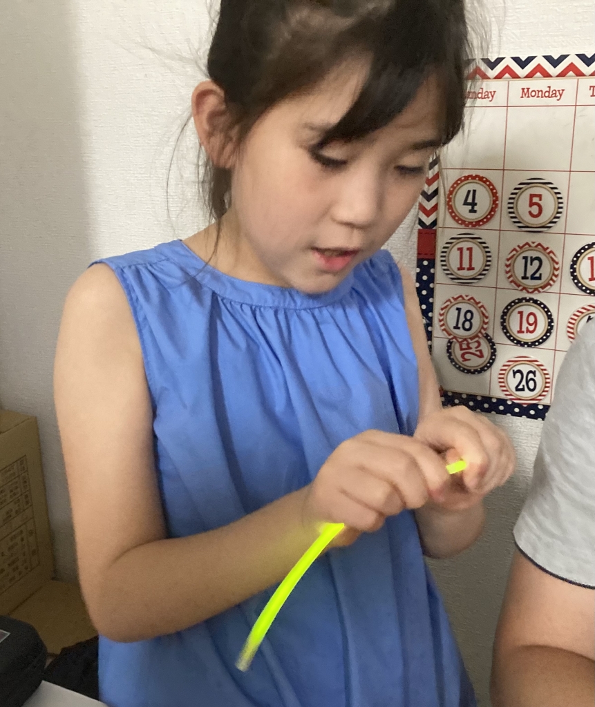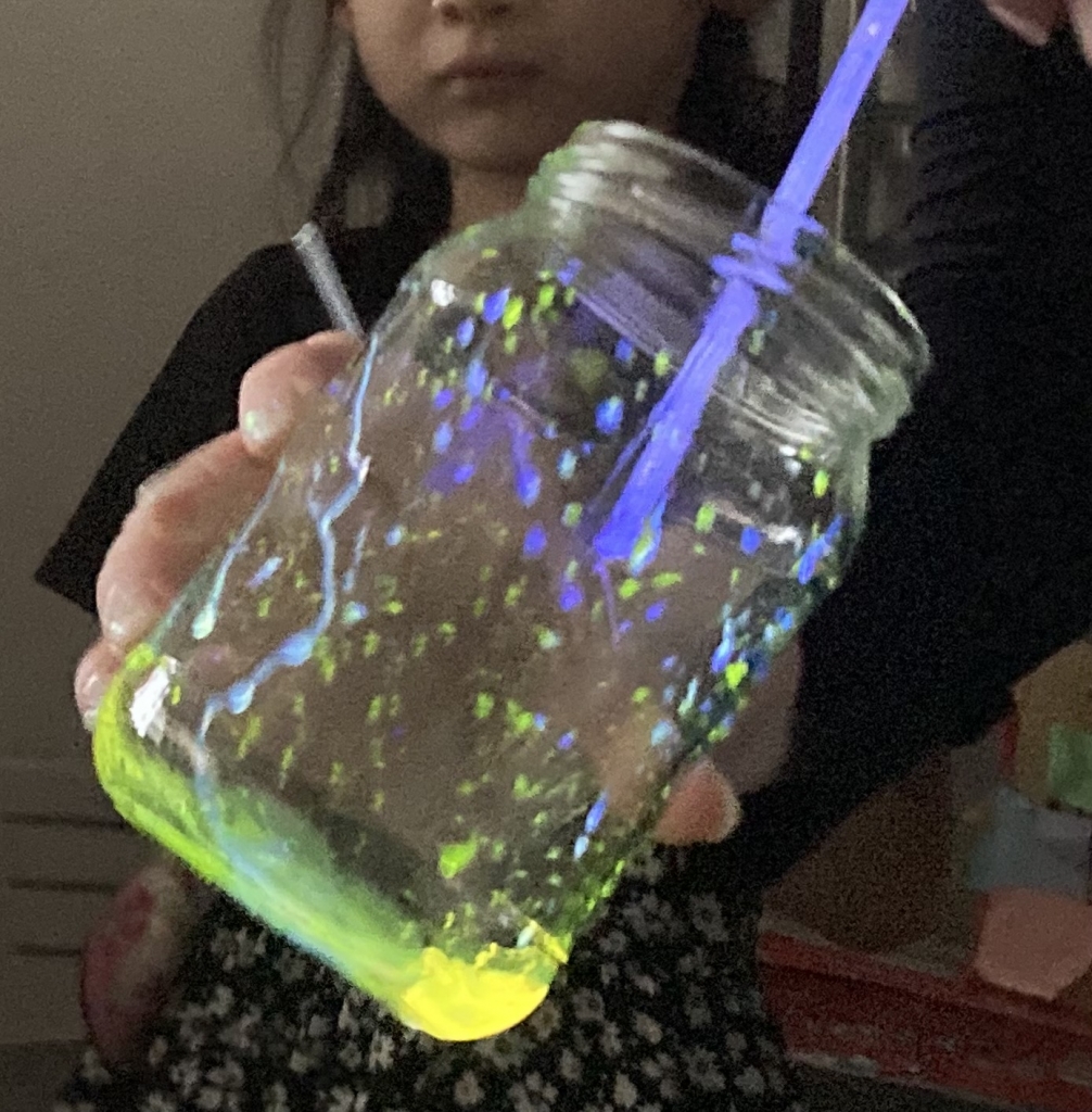 また今日の実験ではglow stickを使い、不思議な光るドリームジャーを作りました。