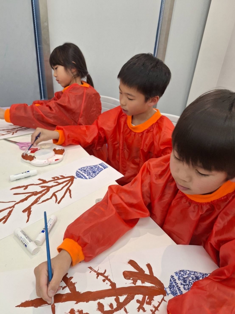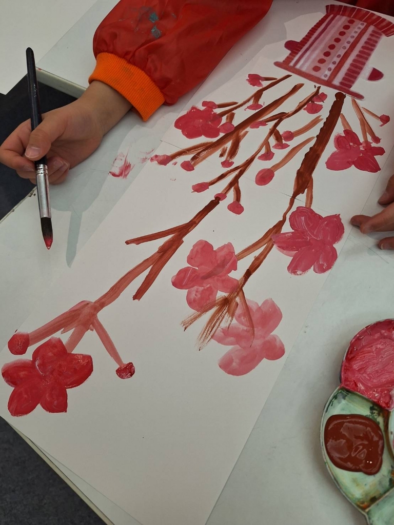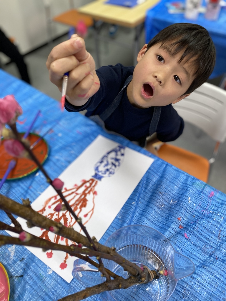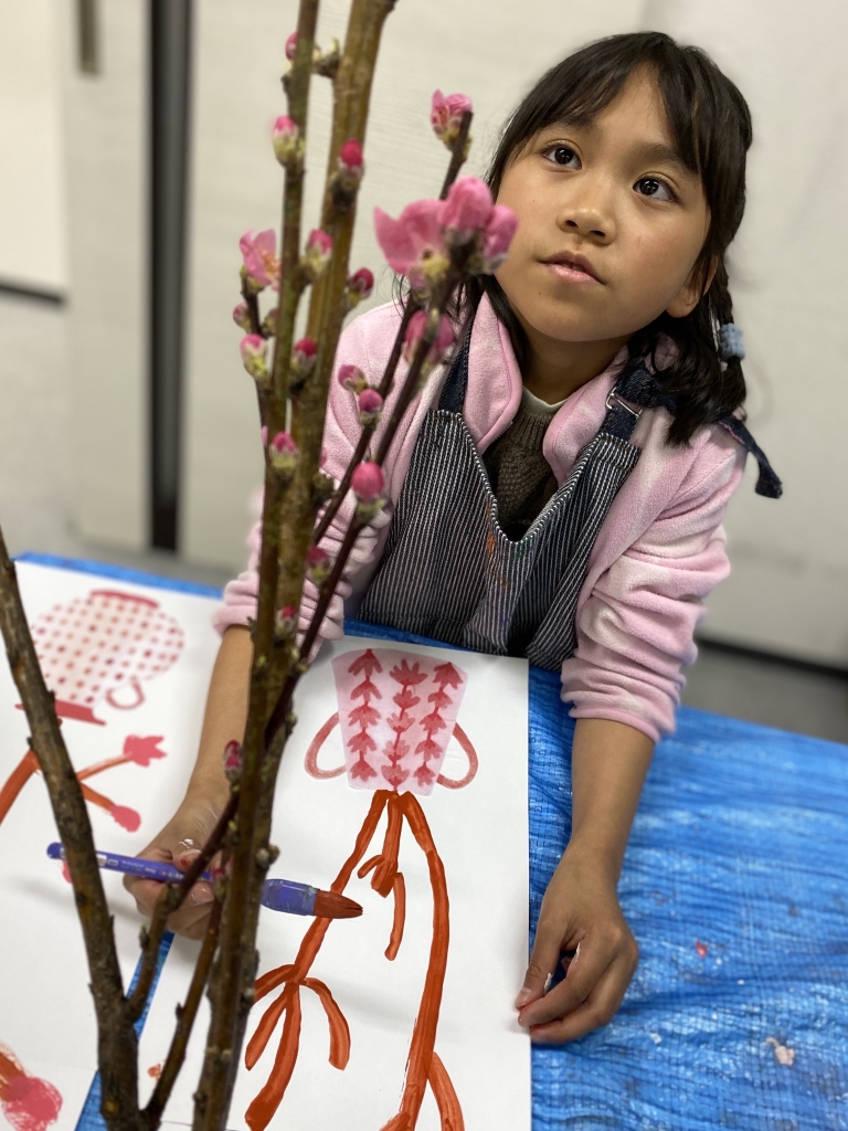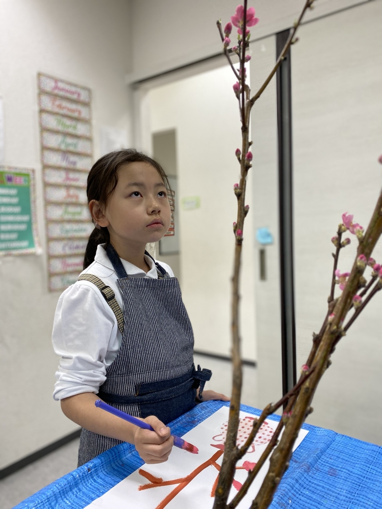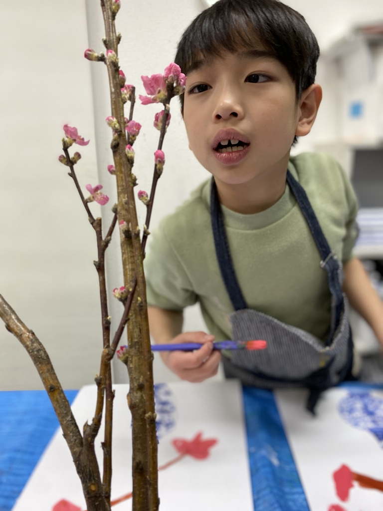 枝の力強さ、花の形や色などしっかり観察して描きました。赤と白の絵具を自分達で混ぜて、桃の花の色に近づけました。