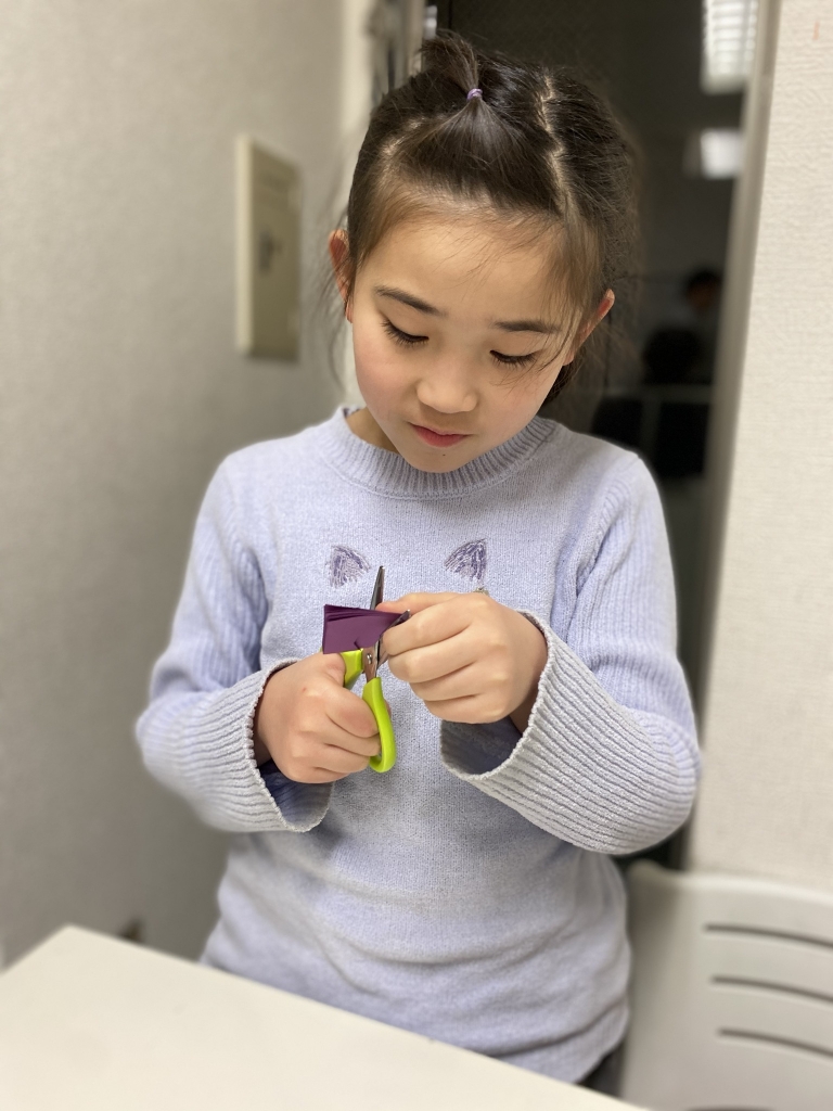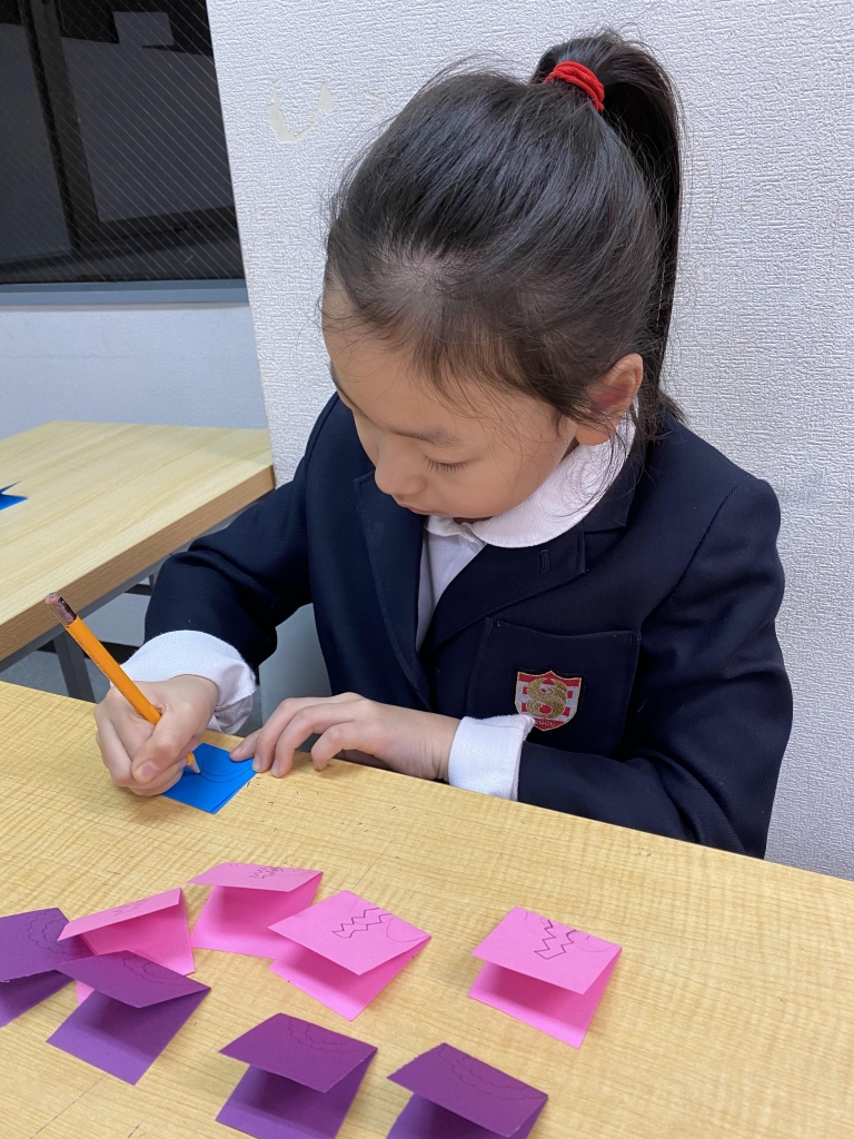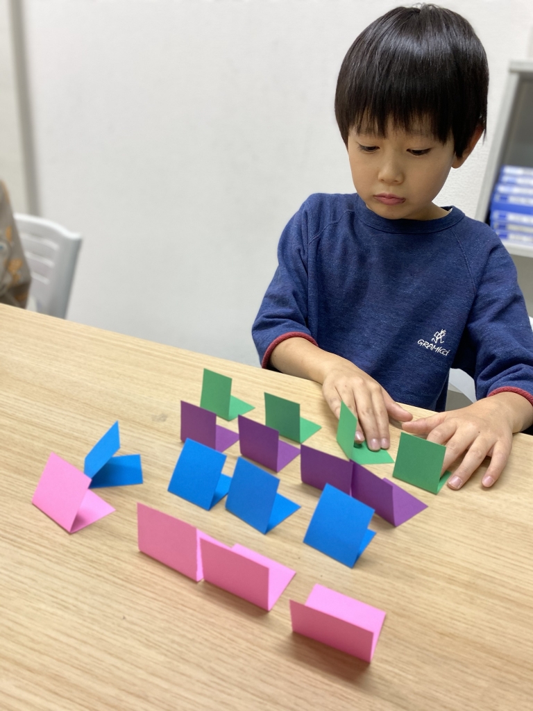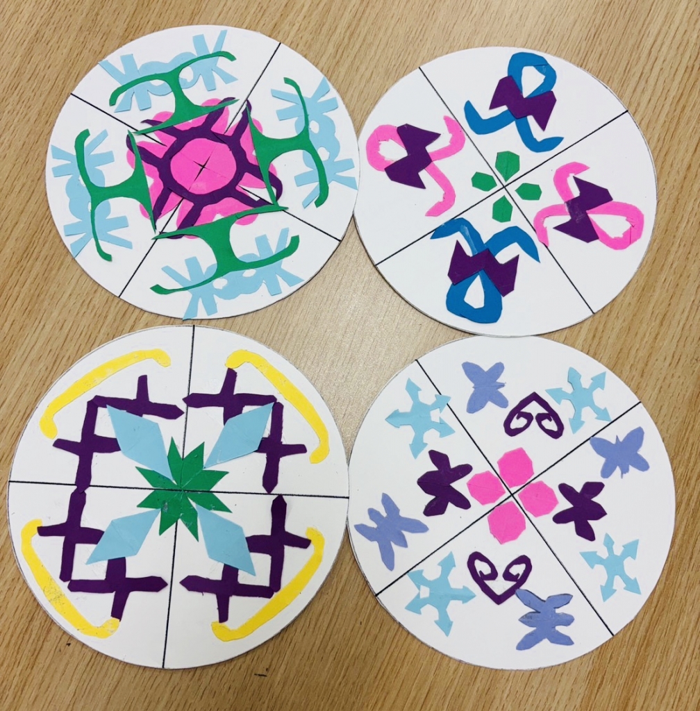 曼陀羅アートは、緻密な模様や幾何学的なデザインが魅力です。4色の色画用紙を半分に折り、4種類の異なるデザインを描きました。