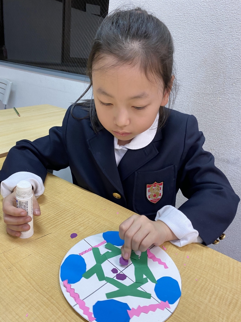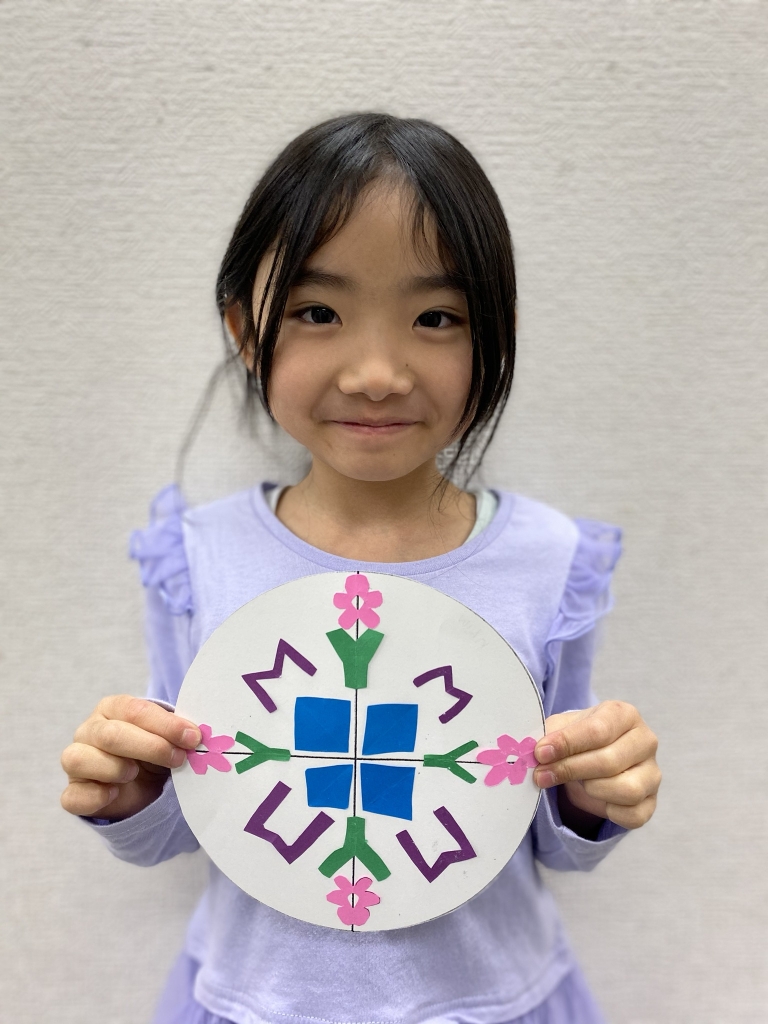 4等分した円の各スペースにデザインした色画用紙を放射線状に並べました。