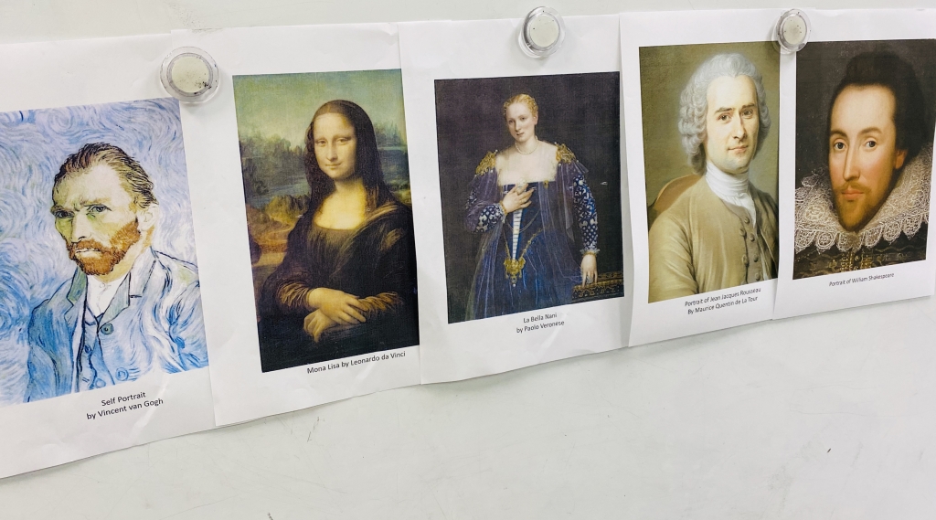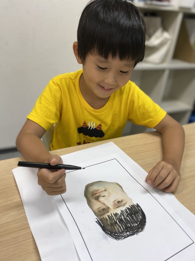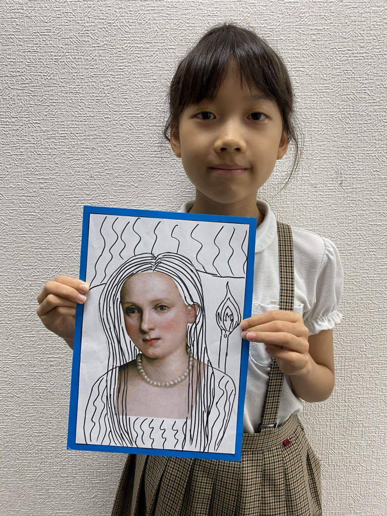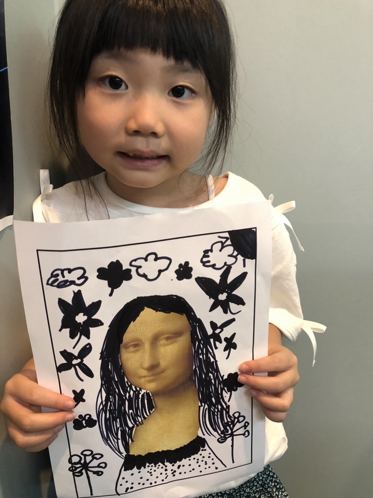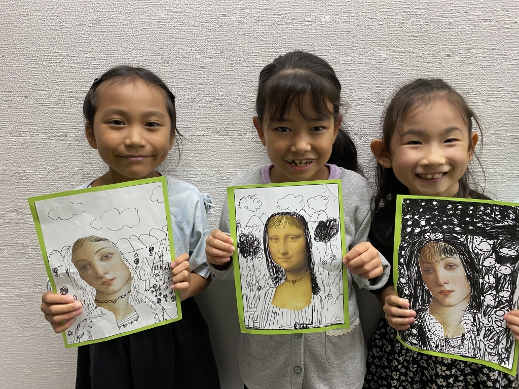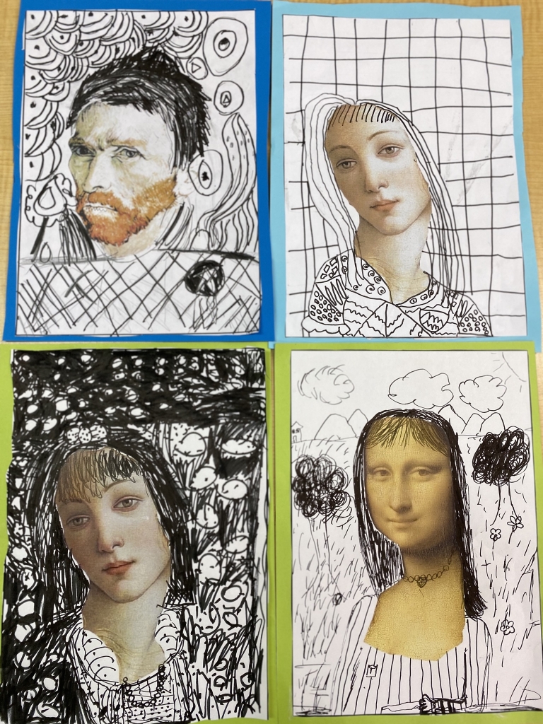 今月のSocial Studiesは、Famous Artistsと題して有名な画家や芸術家について学んでいます。今日のアートは、画家や芸術家の肖像画にちょっと手を加えて面白い作品を描きました。