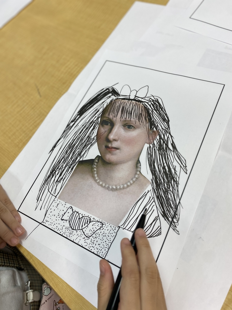 肖像画の顔だけを切り取り、黒のペンで髪の毛や洋服を描き加えていきます。