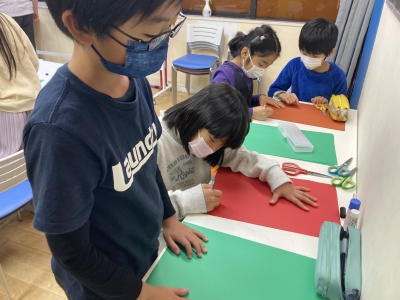 クリスマスパーティーなどで飾れるようツリーやトナカイなどを画用紙で作りました。