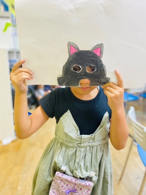前回は、下書き、画用紙に描いて目と鼻の部分に穴をあけるところまでしました。