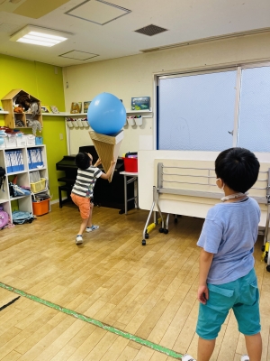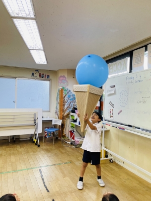 ハットを作り終わった後は、もう1つのアクティビティとして、大きなコーンで風船をキャッチするというゲームを行いました。