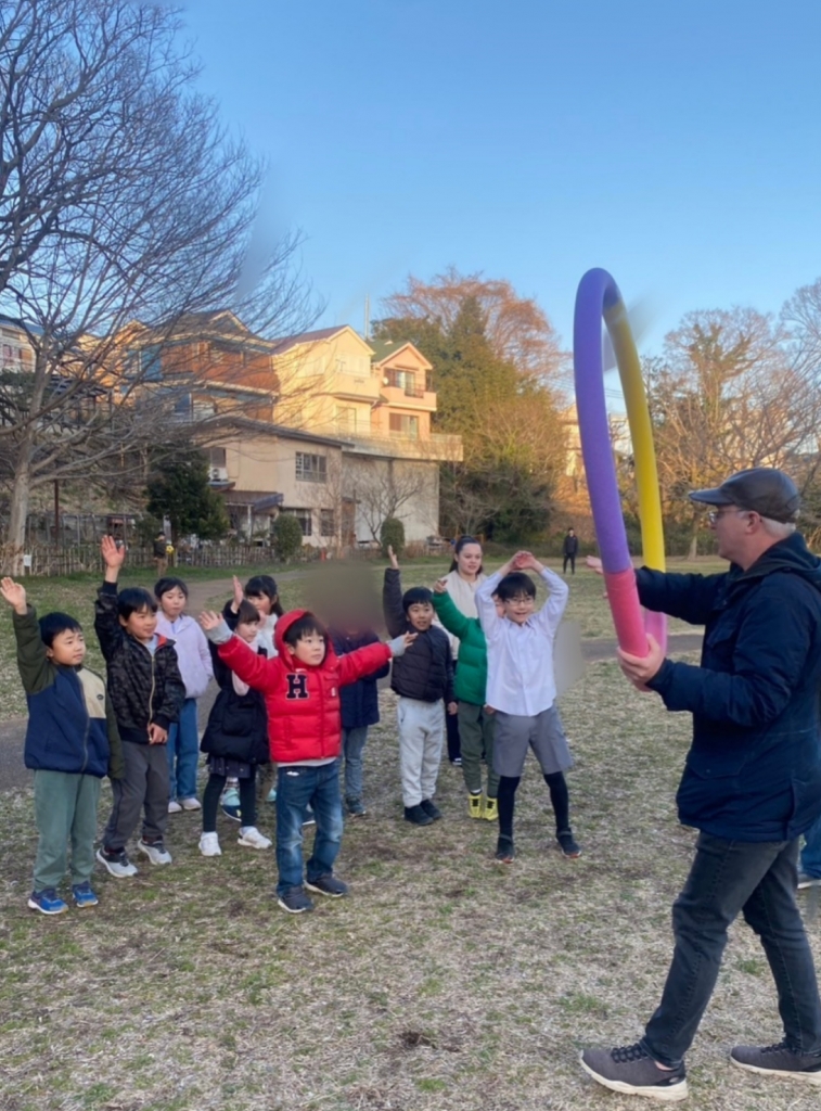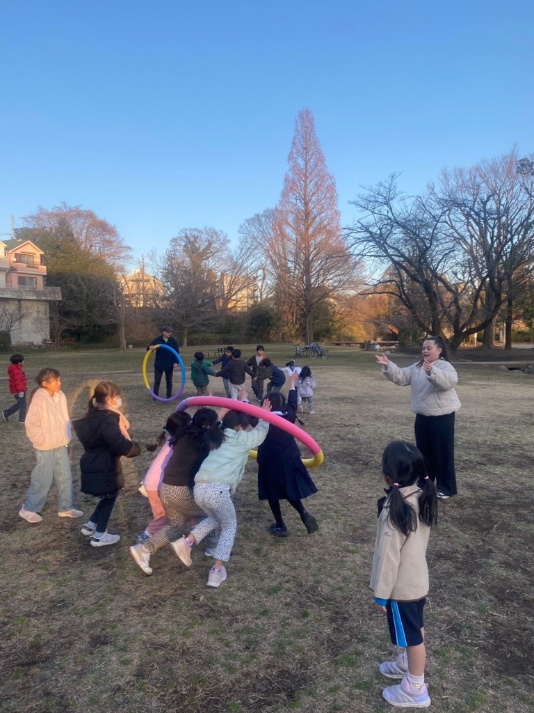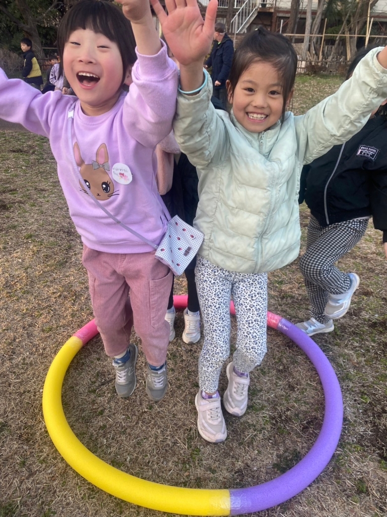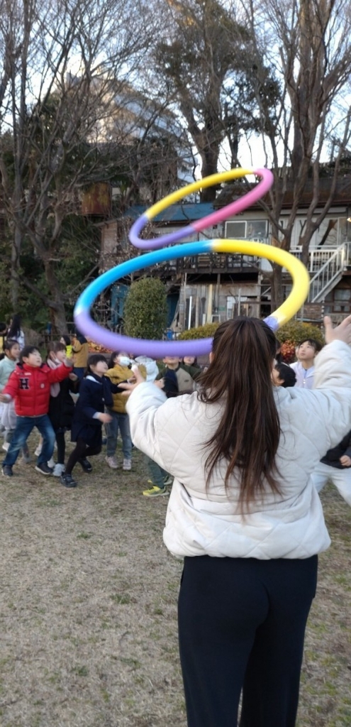 プールヌードルを使って大きな輪を作って、先生の指示を聞いて動くゲームをしました。