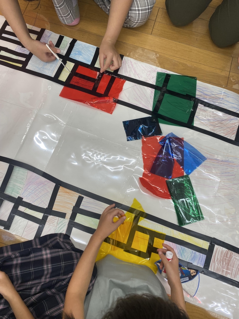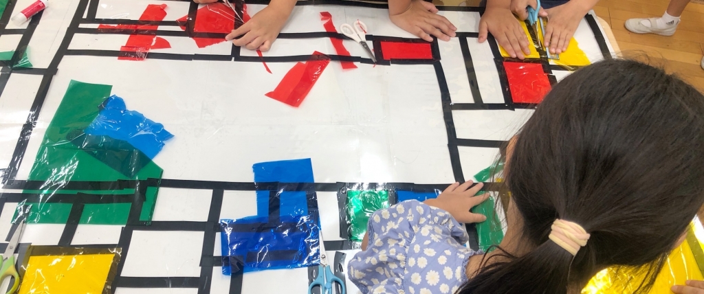 今日のアートは”primary colors”を使用していきます。”red,yellow, blue and green” rectangular forms 使用する色は赤と黄色、青とグリーンで正方形の形だけを作って仕上げるアートのことです。
