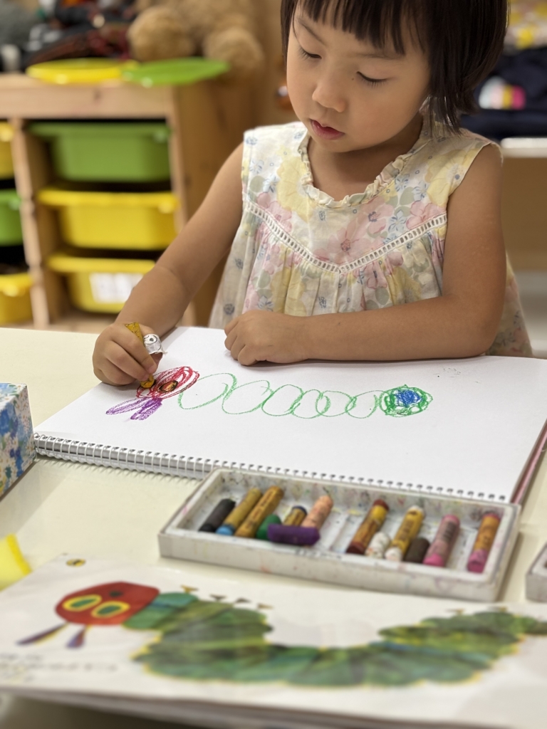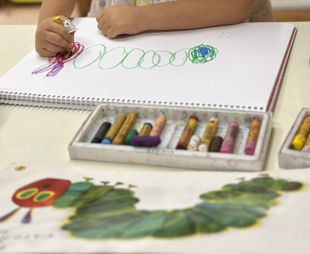 We started off with everyone’s favorite “The Very Hungry Caterpillar”! After we read the book in our sketch book, we drew the hungry caterpillar🐛 Everyone did a great job drawing many ovals for the boy and face.