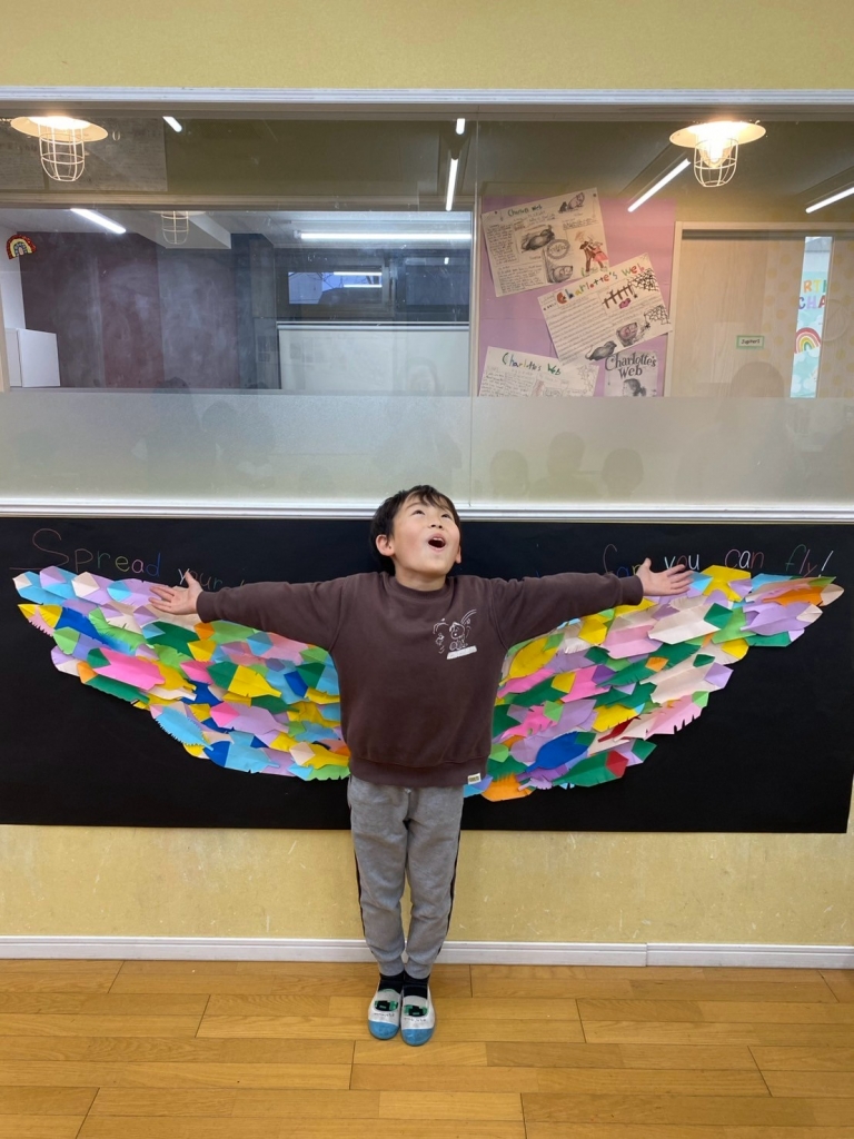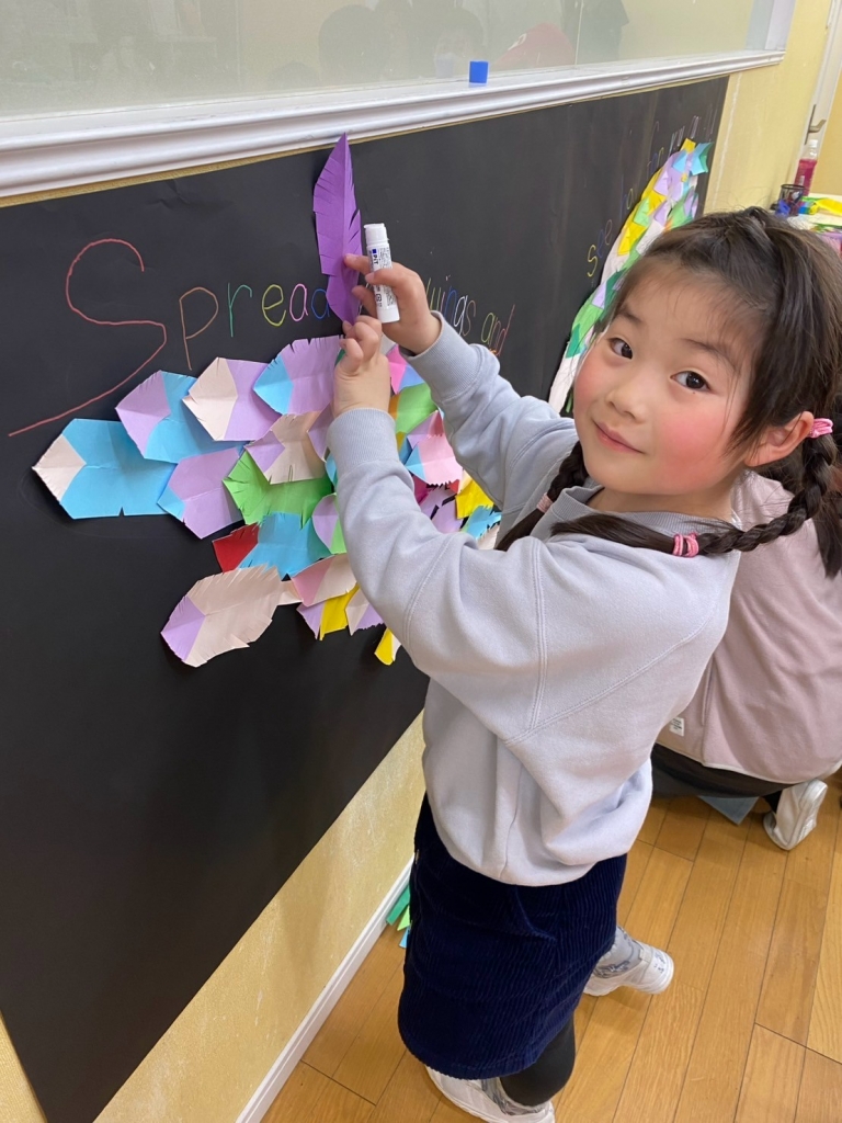 今日のアートは、先週作った羽根を集めて、大きな翼を作りました。